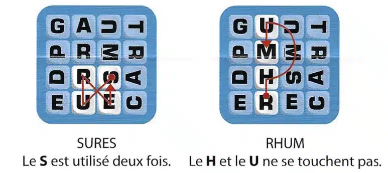 Les lettres qui composent un mot doivent être adjacentes dans l’ordre de formation du mot, et elles peuvent se toucher horizontalement, verticalement ou en diagonale, en allant vers la gauche, la droite, le haut ou le bas. Chaque lettre ne peut être utilisée qu’une seule fois dans le même mot .